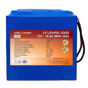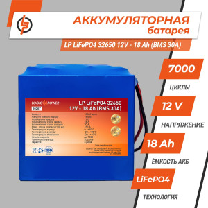 Литий железо-фосфатный аккумулятор LogicPower 12V 18Ah LiFePO4 (BMS 30) 32650 произведенный по технологии LiFePO4 обладает очень широким спектром применения: начиная от электротранспорта и заканчивая спецоборудованием и источниками бесперебойного питания.