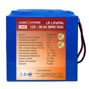 Литий железо-фосфатный аккумулятор LogicPower 12V 30Ah LiFePO4 LP10268 произведенный по технологии LiFePO4 обладает очень широким спектром применения: начиная от электротранспорта и заканчивая спецоборудованием и источниками бесперебойного питания.