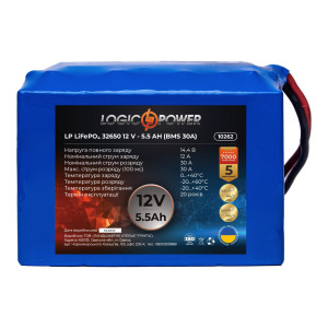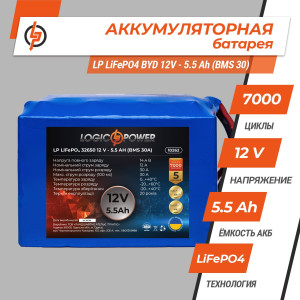 Литий железо-фосфатный аккумулятор LogicPower 12V 5,5Ah LiFePO4 LP10262 произведенный по технологии LiFePO4 обладает очень широким спектром применения: начиная от электротранспорта и заканчивая спецоборудованием и источниками бесперебойного питания.
