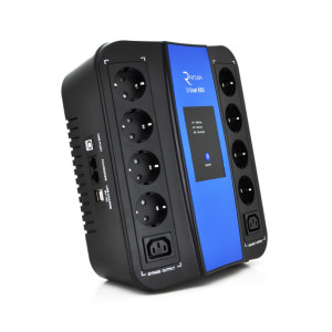 При обычной работе питание поступает от электросети, к которой подключен ИБП. Потребители подключаются в свою очередь к ИБП, в котором встроено 8 розетки евророзетка на 220 (±10%) Вольт. Если в сети пропадает электропитание, то прибор быстро переключается на работу от аккумулятора.