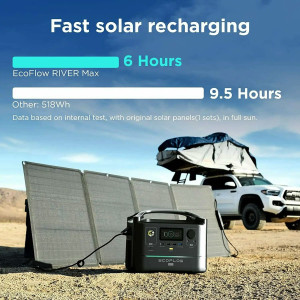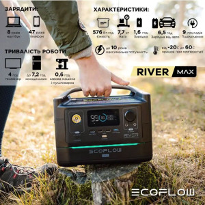 Зарядить аккумуляторную батарею до 80% от источника переменного тока (обычной розетки) можно за час, а пополнить заряд на 100% - за 1,6 часа. Портативная электростанция EcoFlow RIVER Max может быть заряжена от других источников энергии: солнечных панелей EF 110 Вт и EF 160 Вт, автомобильного адаптера. Зарядка этими методами занимает 3-6 часов и 6,5 часов соответственно.