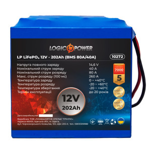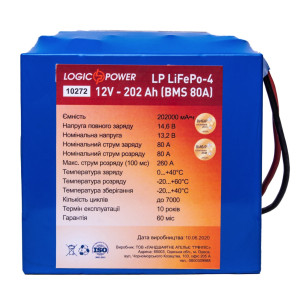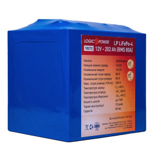 Літій залізо-фосфатний акумулятор LogicPower 12V 202Ah LiFePO4 LP10272 виготовлений за технологією LiFePO4, володіє дуже широким спектром застосування: починаючи від електротранспорту і закінчуючи спецобладнанням і джерелами безперебійного живлення.