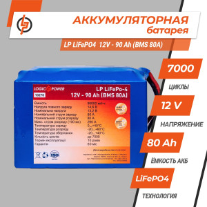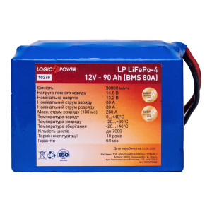 Літій залізо-фосфатний акумулятор LogicPower 12V 90Ah LiFePO4 LP10270 виготовлений за технологією LiFePO4, володіє дуже широким спектром застосування: починаючи від електротранспорту і закінчуючи спецобладнанням і джерелами безперебійного живлення.