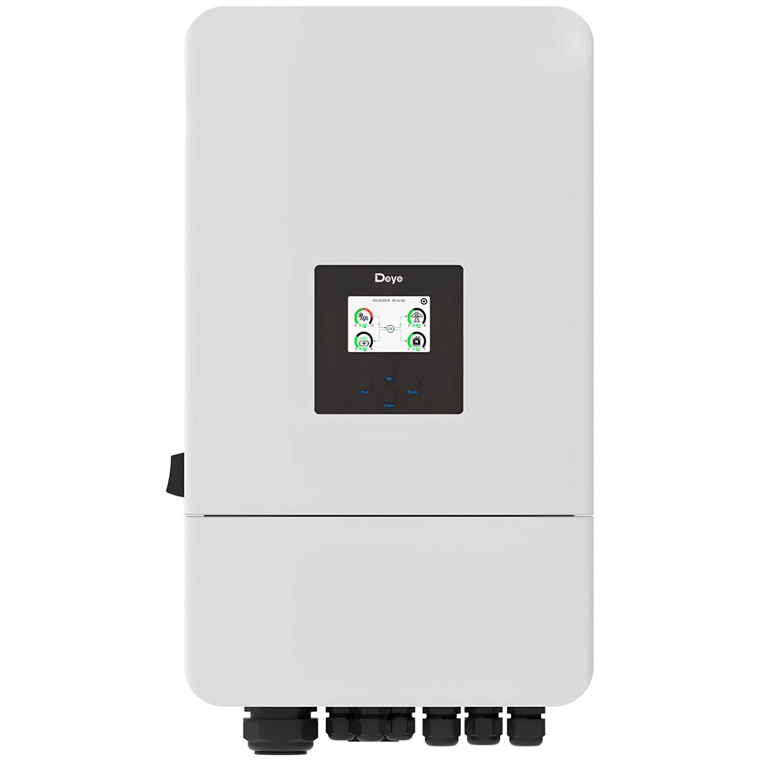 Deye SUN-10K-SG05LP3-EU-SM2 — це сучасний трифазний гібридний інвертор потужністю 10 кВт, який поєднує в собі функції мережевого інвертора, контролера заряду, автоматичного перемикача та зарядного пристрою для акумуляторів. Працює з акумуляторами 48 В, сонячними панелями (до 13 кВт), мережею та генератором.