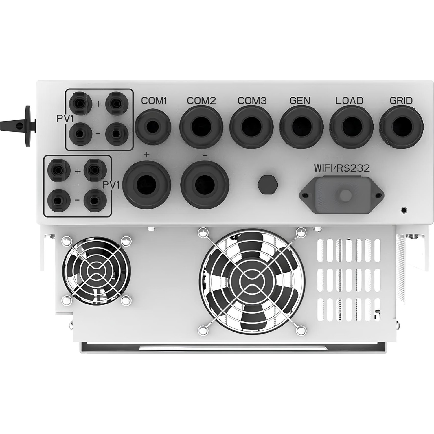 Інвертор працює з низьковольтними акумуляторами 48 В, зокрема з сучасними батареями LiFePO₄, які відзначаються безпечністю, стабільністю і тривалим ресурсом. Пристрій має інтелектуальну систему керування зарядом, визначає пріоритети джерел енергії (сонце, мережа, акумулятор) і автоматично переходить у резервний режим при зникненні мережі.