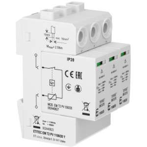 Обмежувач перенапруги ETITEC EM T2 PV 1100/20 Y розроблений компанією ETI (Словенія) спеціально для фотоелектричних установок з високою напругою постійного струму. Працює в мережах до 1100 В DC, забезпечуючи надійний захист панелей, стрінгів, кабельних ліній та інверторів від грозових імпульсів і внутрішніх перенапруг.